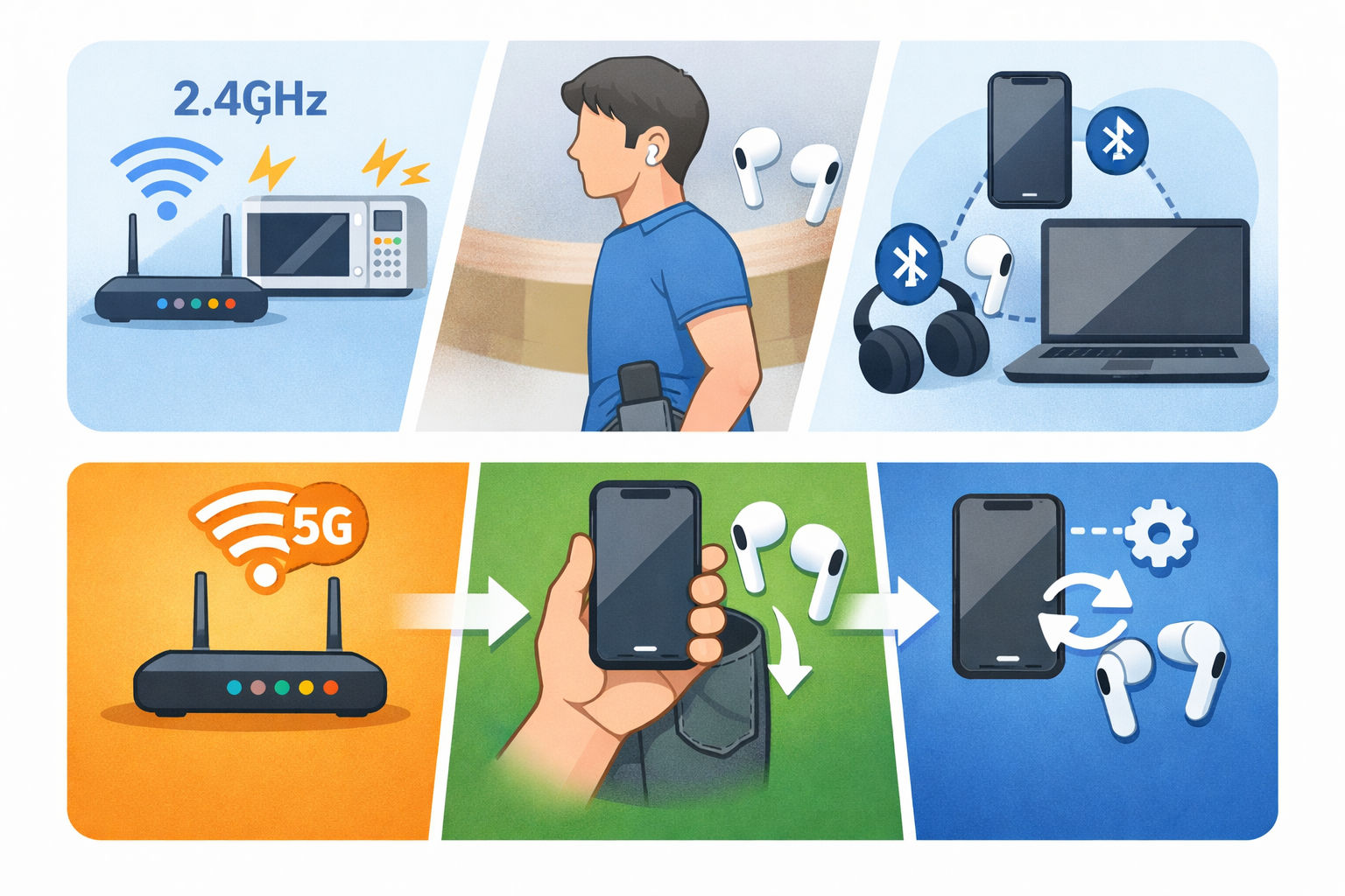[블루투스 끊김은 대부분 2.4GHz 간섭·거리/차폐·멀티포인트 꼬임이다 — 5GHz 전환 → 폰 위치 조정 → 1대만 연결+재페어링 순서로 보면 가장 빠르게 잡힌다]